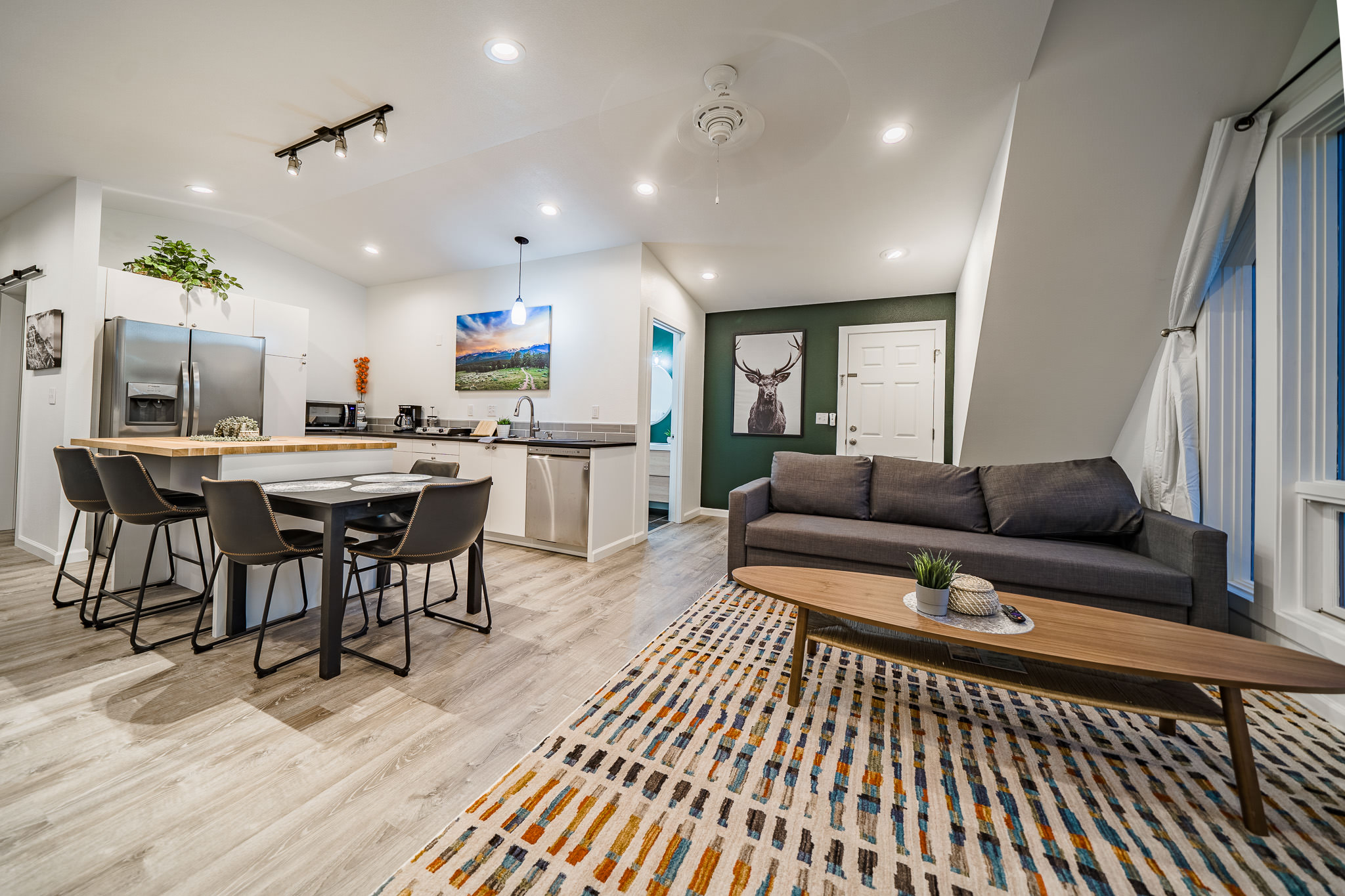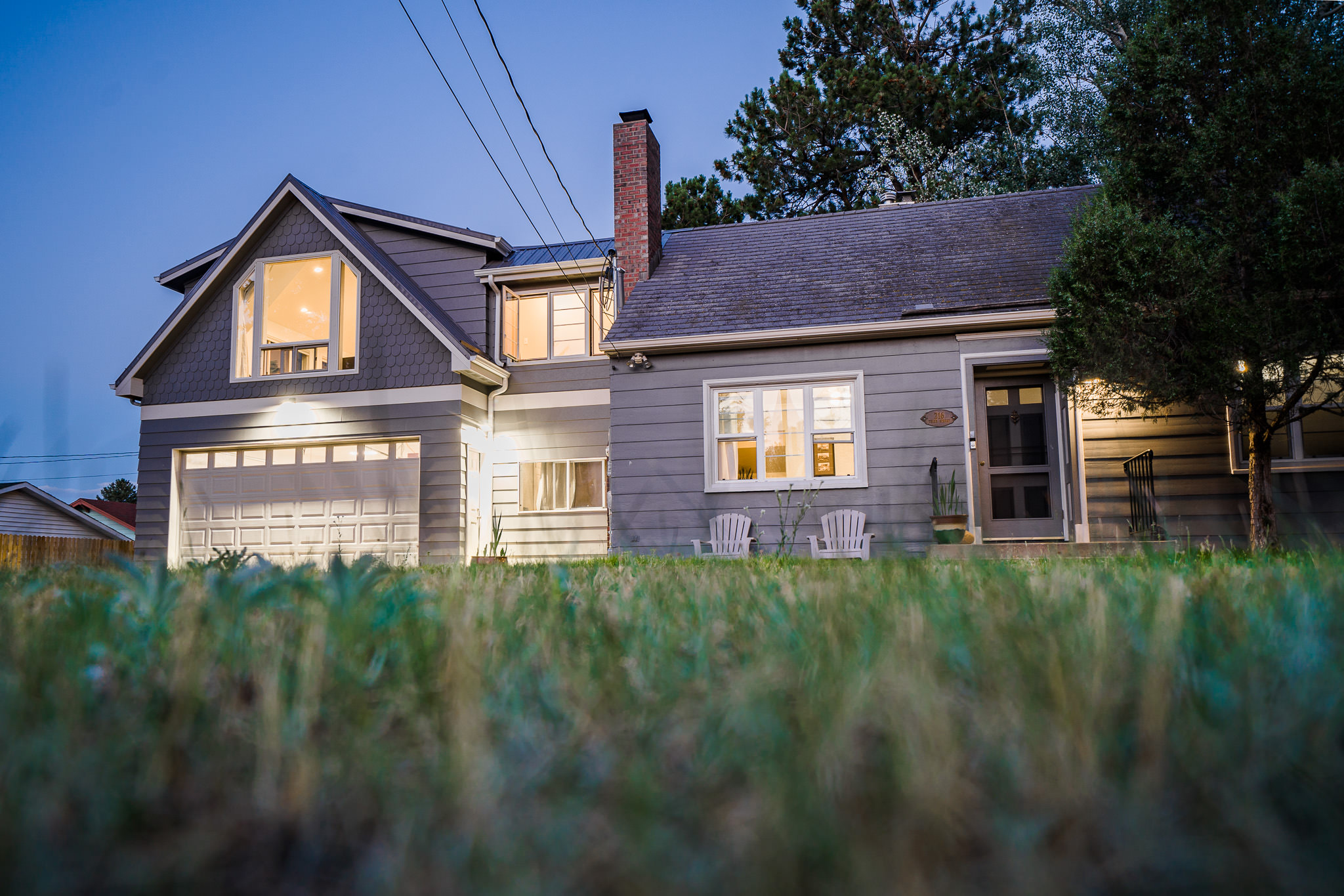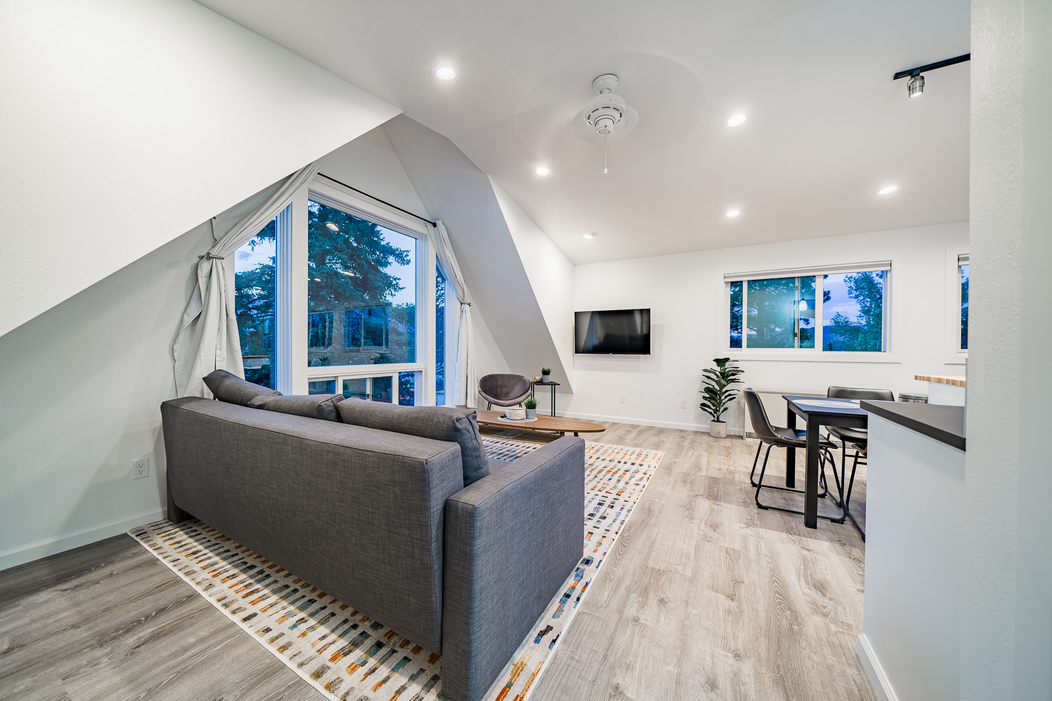 The owners, who live in the attached home, wanted ot create an inviting space that makes you feel like you’re high up in the air. They are avid rock climbers, after all! The massive second-floor picture windows offer commanding views over our neighborhood to the mountains of Lumpy Ridge and the twinkly lights of the Stanley Hotel.