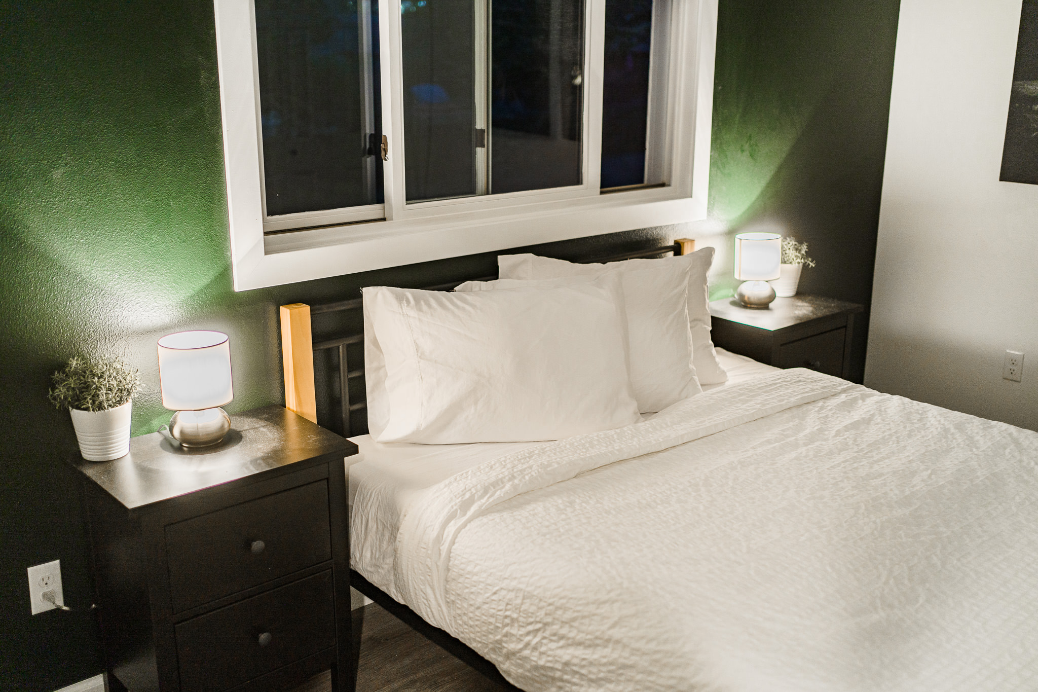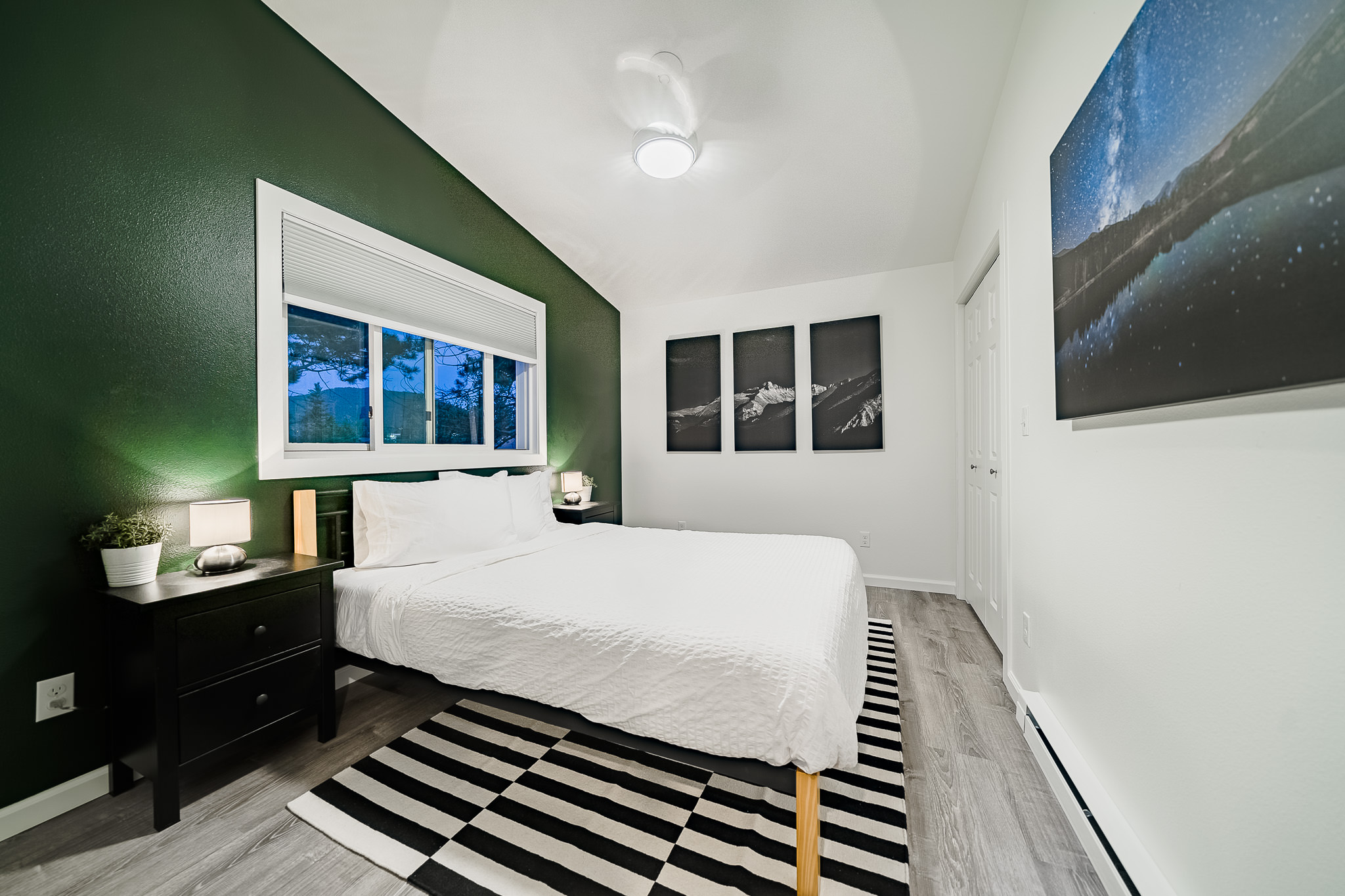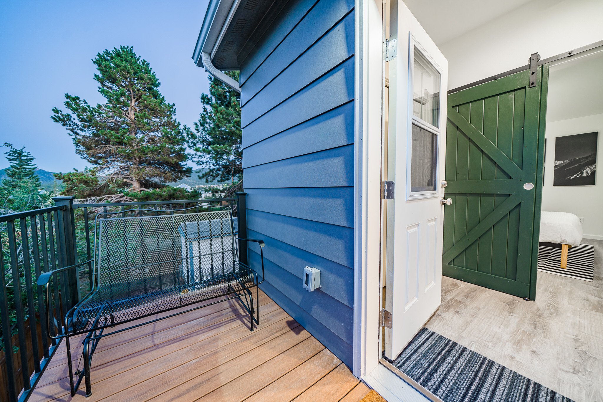 The owners, who live in the attached home, wanted ot create an inviting space that makes you feel like you’re high up in the air. They are avid rock climbers, after all! The massive second-floor picture windows offer commanding views over our neighborhood to the mountains of Lumpy Ridge and the twinkly lights of the Stanley Hotel.