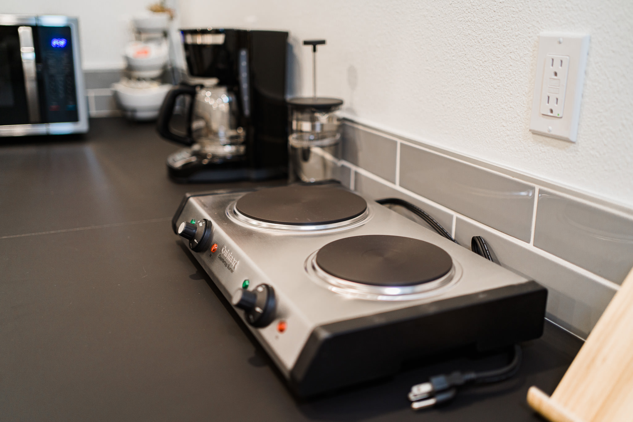 - Cooking: 2 burner cooktop. No oven.