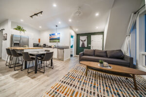 The space features an open floor plan with vaulted ceilings, so it feels big for its 600-ish square feet. The kitchen/dining/living area encourages socialization and it’s got a funky, modern vibe. At the same time, the cozy bedroom in the rear of the building is quiet as can be.