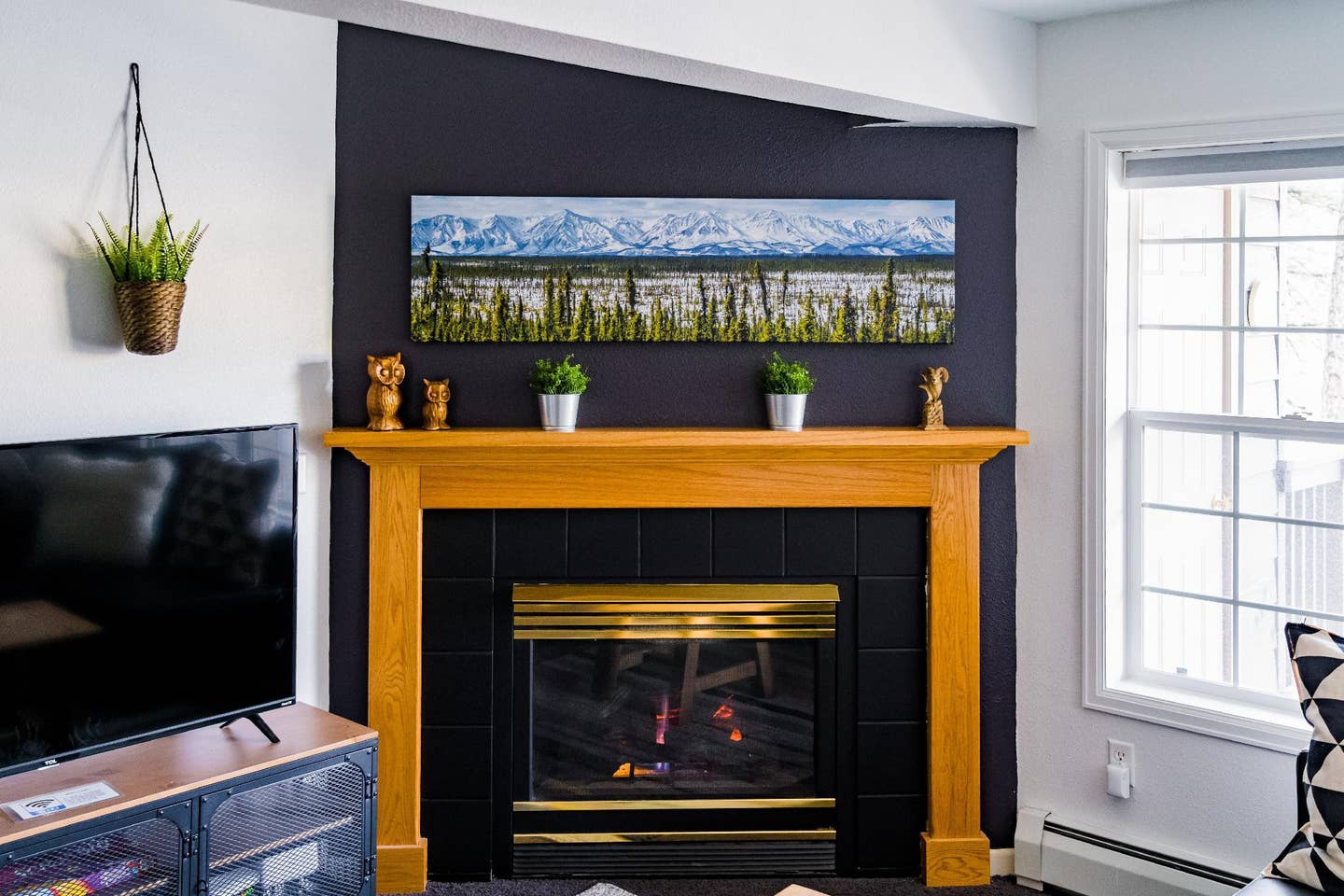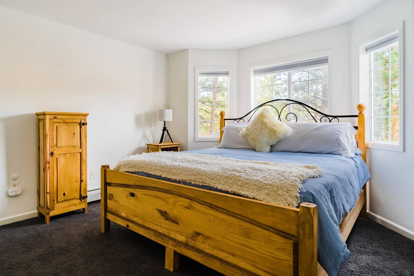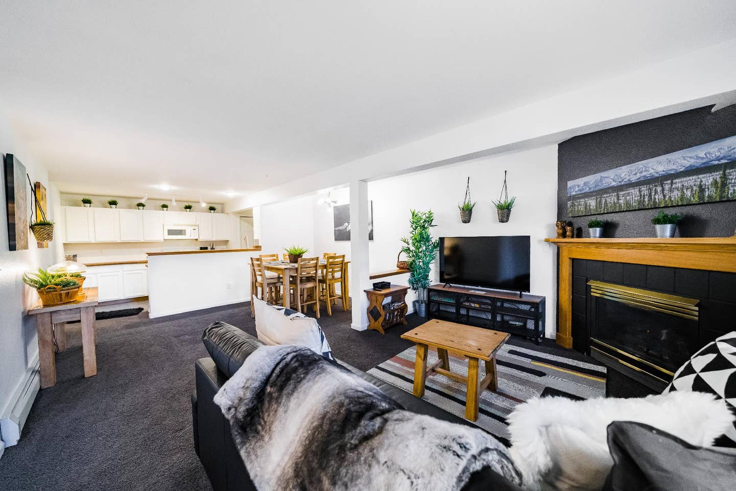As for the cozy space itself, once you walk inside you’re greeted with a spacious living room with a large leather couch, gas fireplace, and beautiful pine furnishings. Speedy WiFi is provided for free.