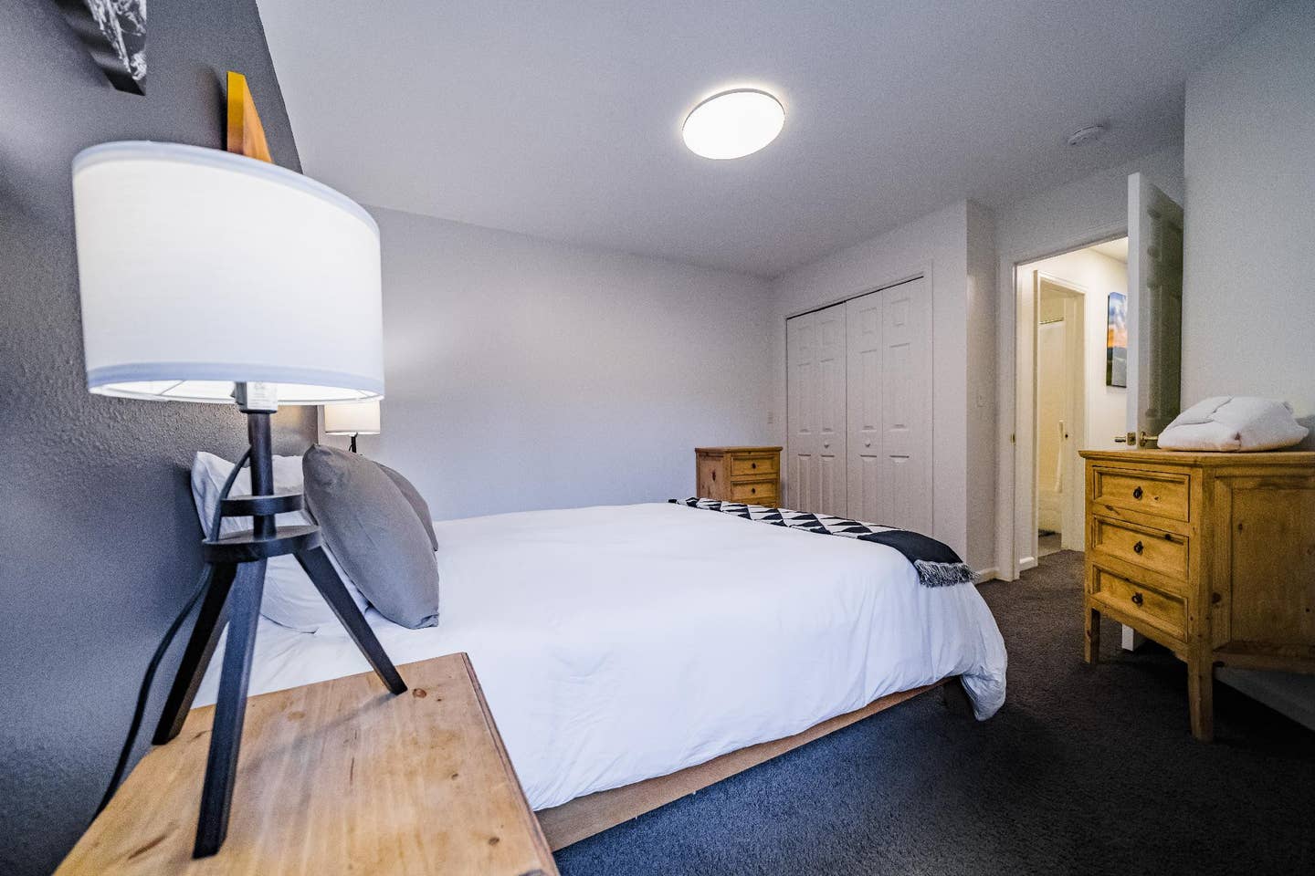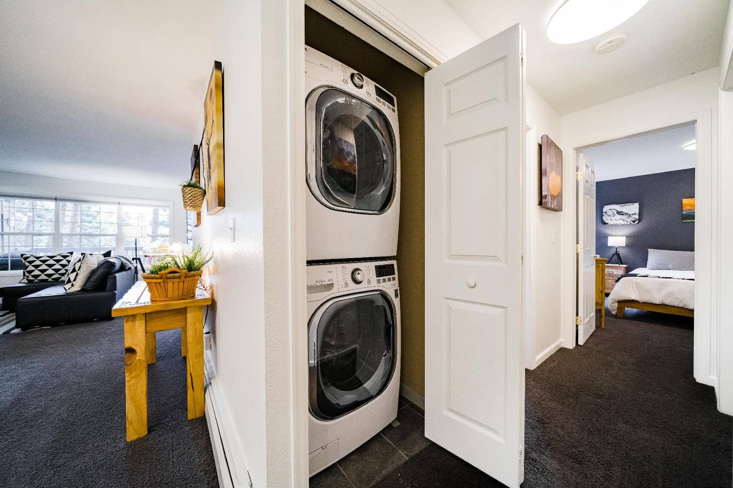 The open floor plan leads to a modern kitchen that’s fully equipped so you can cook your own meals. You’ll have your own fridge, oven, and pots/pans/plates/dishes. Attached to the living room is a large master bedroom suite with huge king size bed, lots of closet space and a great bathroom. Adjacent to the kitchen is a second full sized bathroom, a cozy and very quiet bedroom with a queen bed, and a third bedroom with two twin beds. You’ll also have access to a washer/dryer in a closet next to the second bathroom. The living room couch turns into a sofa bed, enabling sleeping for up to 8 (2 in a king bedroom, 2 in a queen bedroom, two in the bedroom with two smaller beds, and two on couch).
