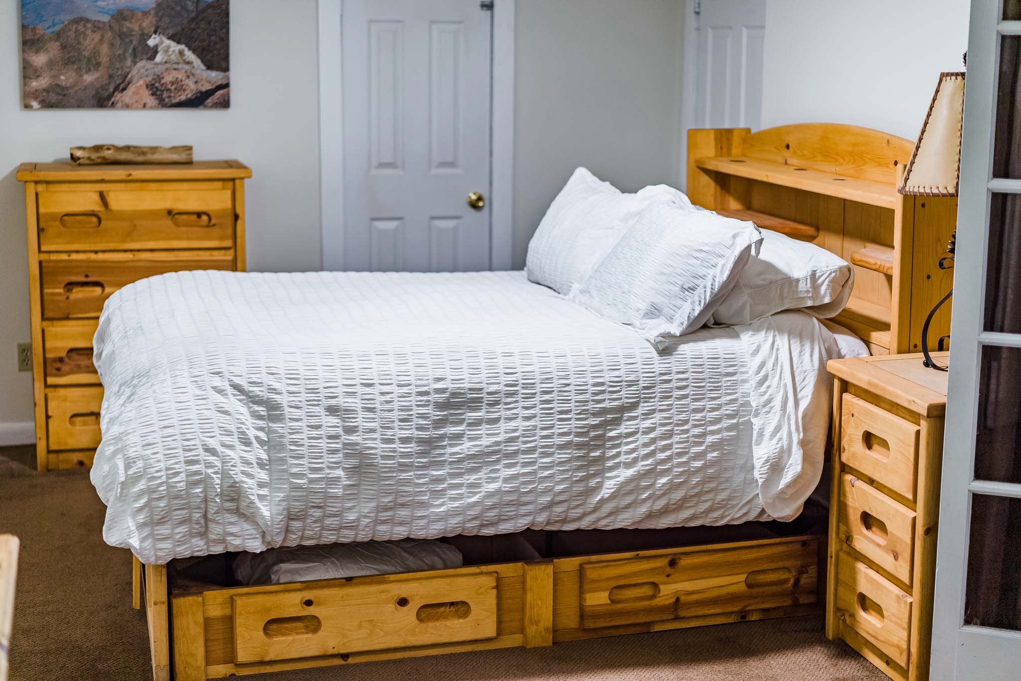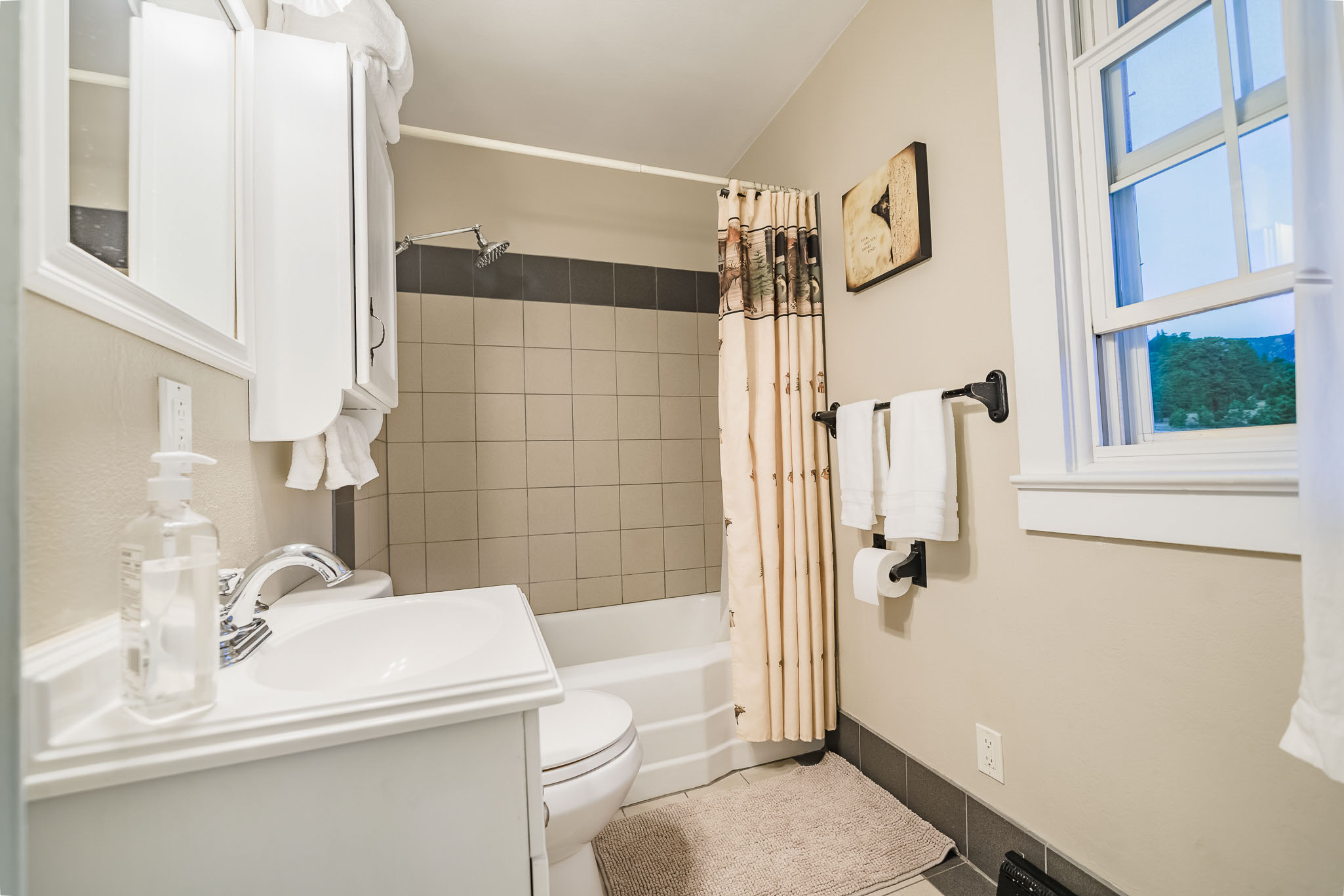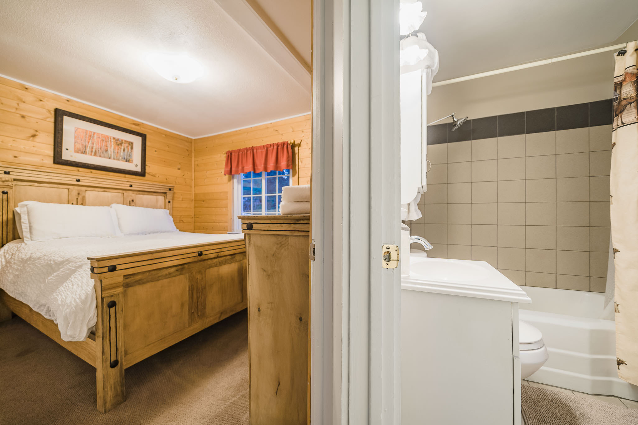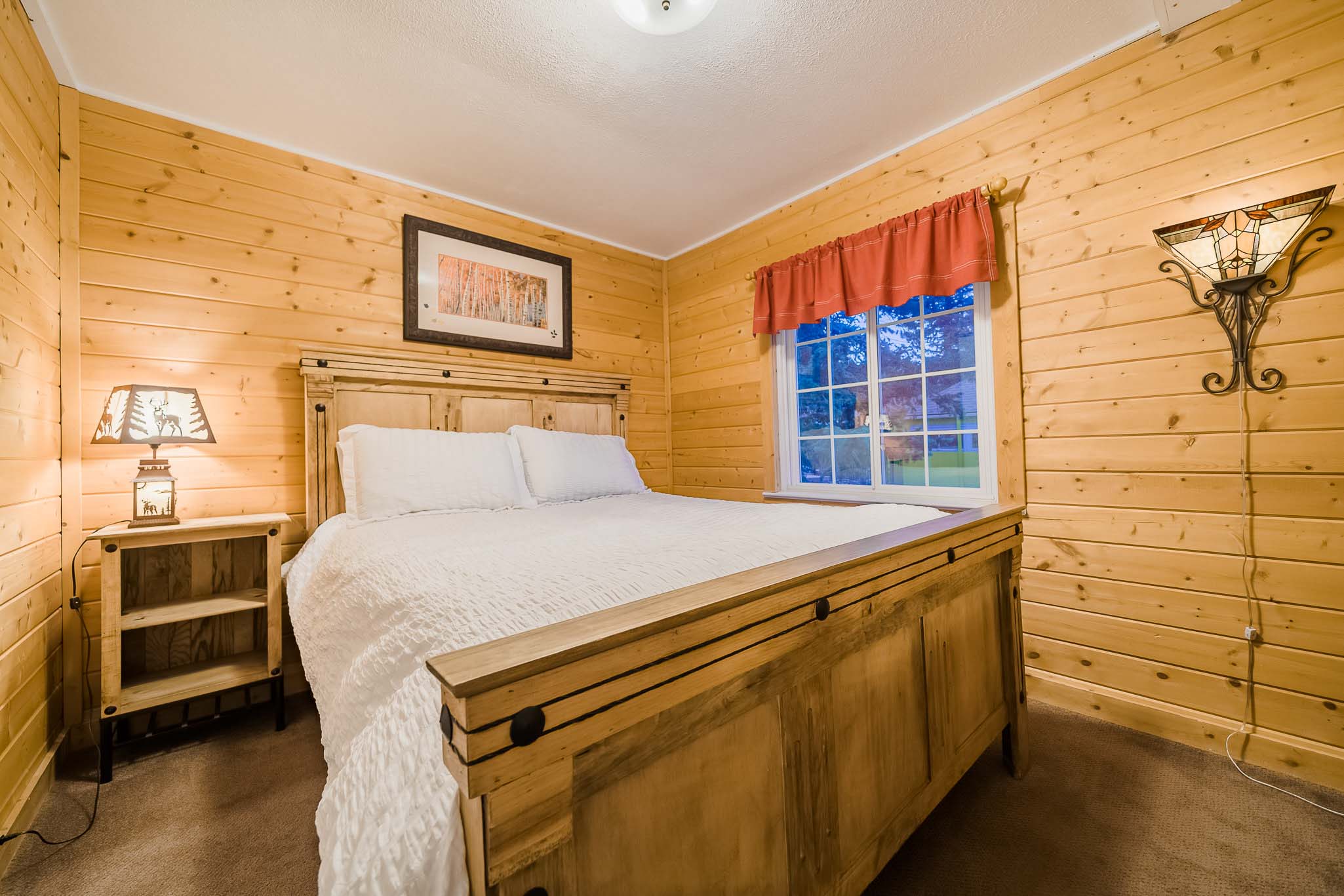 Twin Owls Cottage offers 3 bedrooms. There’s a cozy main floor bedroom with comfortable queen bed and warm, inviting wood walls. A second bedroom downstairs features another queen, as well as a third bedroom with two twins. Downstairs features a second bathroom. We do provide a pullout sofa bed for more options.