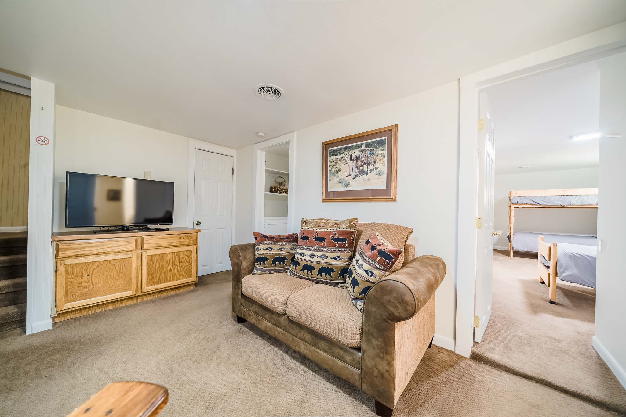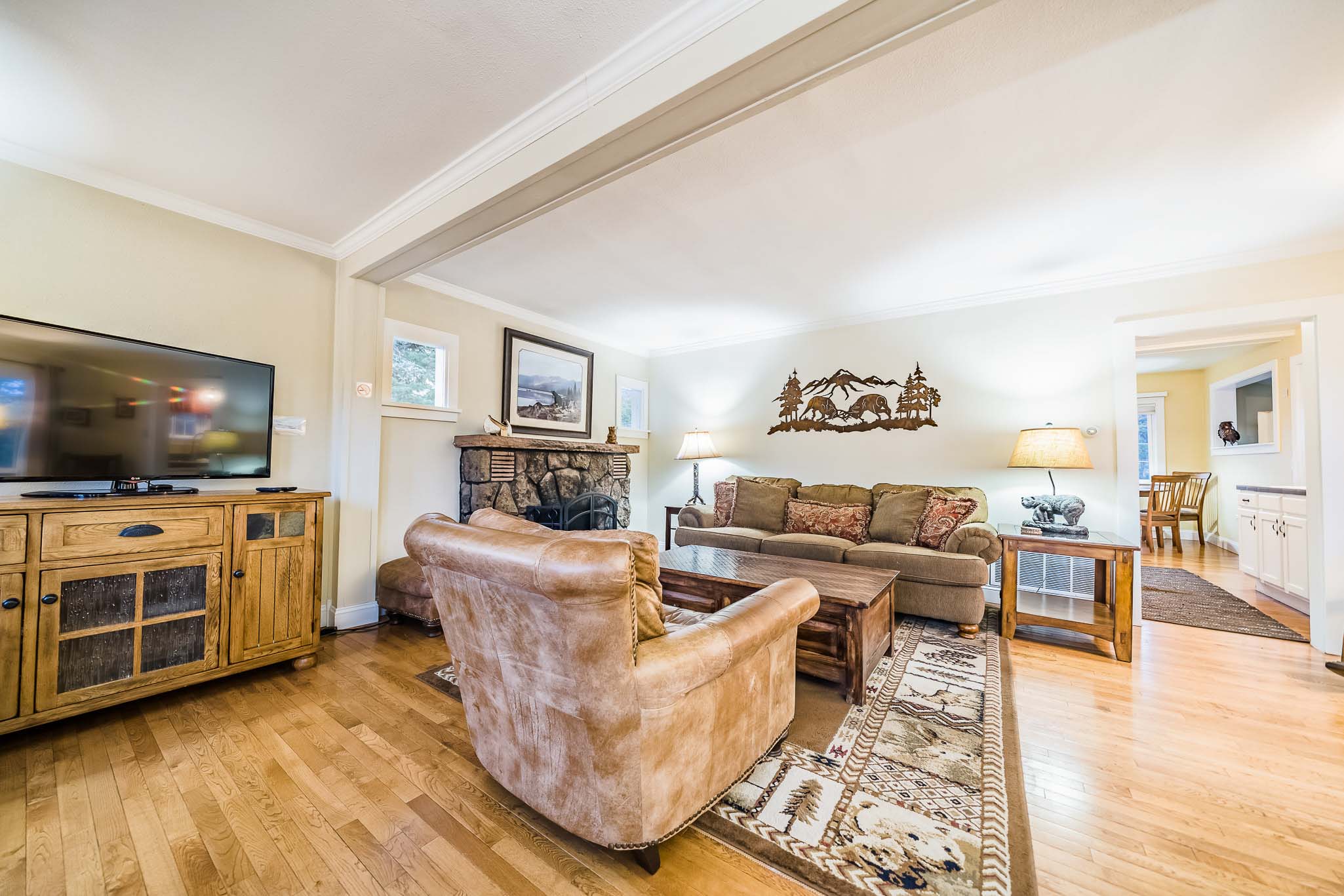 Living Room – The home has a cozy living room with indoor fireplace, comfortable sofa, dining area, luxurious reading chair, and lots of natural light. A smart TV offers lots of streaming options (bring your own accounts).