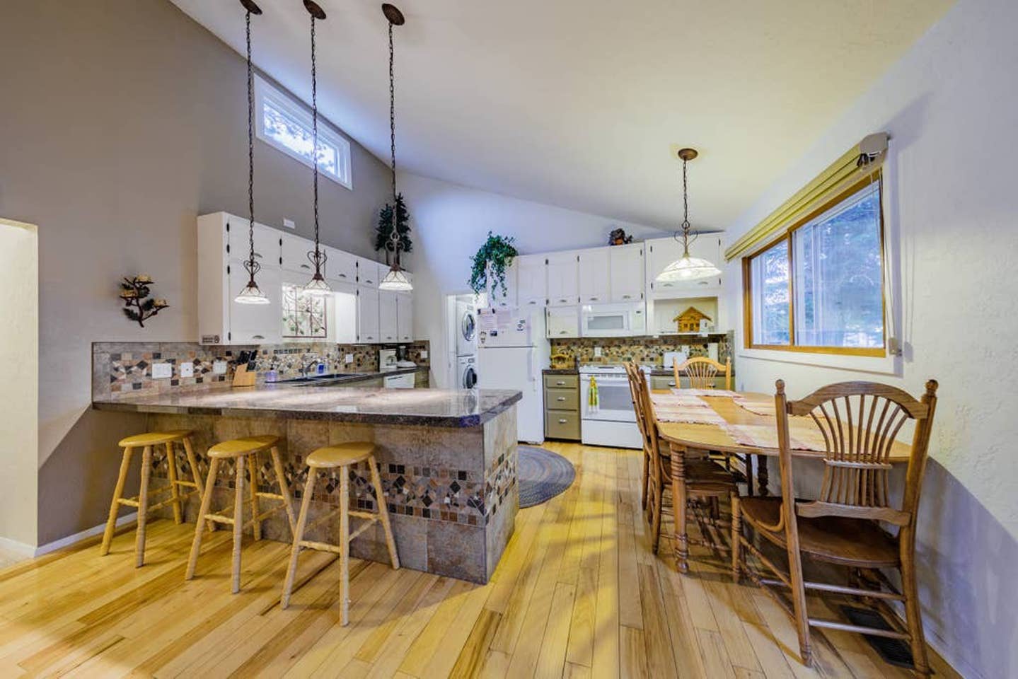 The kitchen is fully equipped with a blender, coffee maker, fridge/freezer, pots and pans, cutlery, silverware, baking supplies, and all the gadgets and utensils you can imagine. There’s a great breakfast bar and a kitchen table. The open living space also features a huge couch you can sink into, as well as additional seating, all centered around a cozy gas fireplace.